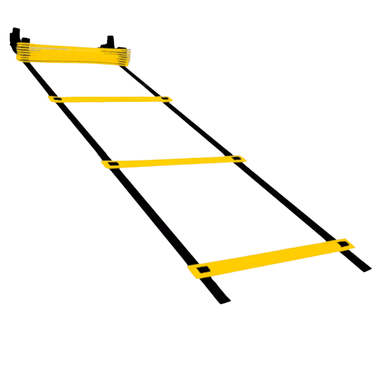A escada possui degraus amarelos fixados sobre fitas pretas, garantindo boa visibilidade durante o uso. Seu comprimento de 5 metros oferece espaço adequado para diferentes tipos de exercícios funcionais, melhorando a performance muscular e reflexos.